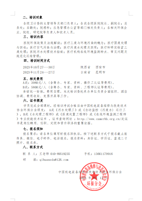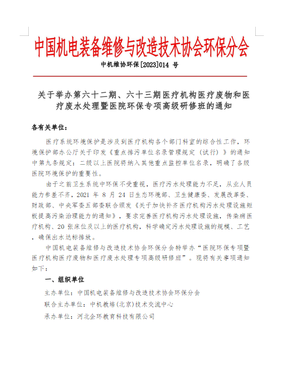 關(guān)于舉辦醫(yī)院環(huán)保專項(xiàng)暨疫情防控常態(tài)化下“醫(yī)療機(jī)構(gòu)醫(yī)療廢物和醫(yī)療廢水處理高級研修班”的通知!