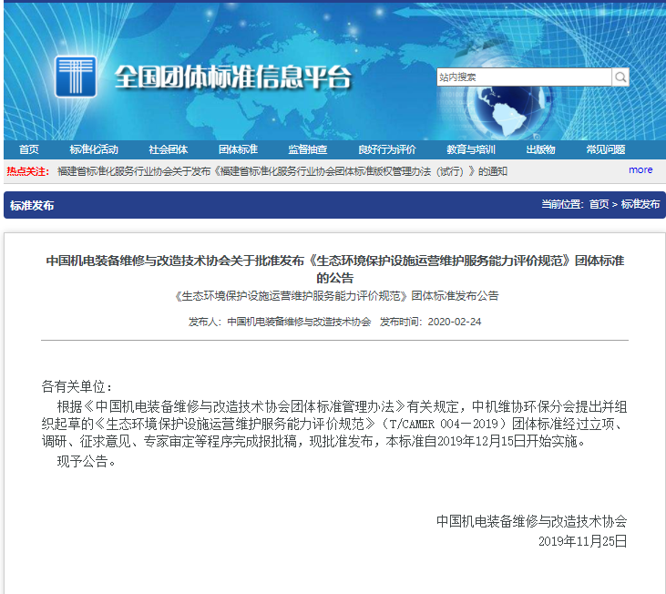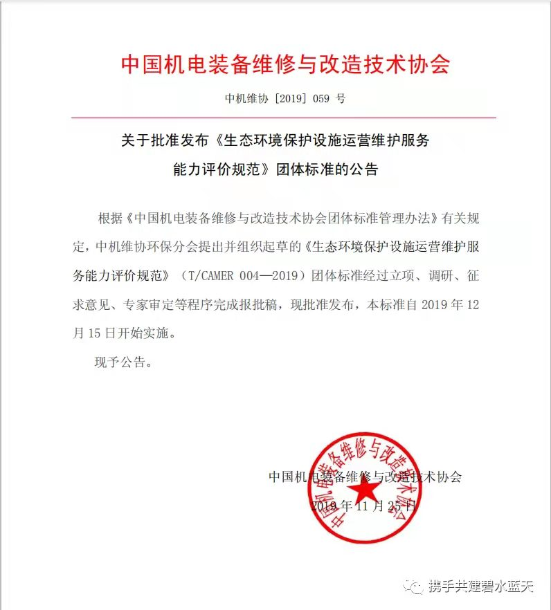 由鳳凰網(wǎng)報道,由中國機電裝備維修改造技術協(xié)會發(fā)起,聯(lián)合河北省環(huán)保治理運營行業(yè)協(xié)會、佛山市中環(huán)環(huán)保技術研究中心、中機國際工程設計研究院有限責任有限公司華東分院、廣東敏義環(huán)境科技有限公司、深圳市環(huán)境治理光電產業(yè)有限公司、佛山攸威光電科技有限公司、山東領先機械制造有限公司、山東濟寧精誠科技有限公司、山東棗莊遠程環(huán)??萍加邢薰尽⑹仪f科林威爾環(huán)??萍加邢薰疽约笆仪f曼特水處理有限公司共同起草的《生態(tài)環(huán)境保護設施運營維護服務能力評價規(guī)范》團體標準,于2019年11月25日獲批發(fā)布,并于2019年12月15日正式實施。這是由協(xié)會牽頭制定的又一項關于生態(tài)環(huán)境行業(yè)方面的團體標準,不僅為提高生態(tài)環(huán)境保護設施運營維護企業(yè)的運營服務質量控制奠定良好的基礎,更為第三方治理行業(yè)的良性健康發(fā)展保駕護航。